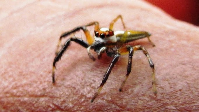 It's an above average size for jumping spiders. The thin, striped abdomen and red head make the male fairly easy to identify. Females have lighther brown bodies with the abdominal stripes.